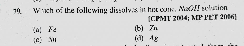 Which of the following dissolves in hot conc. NaOH solution (a) Fe (b) Zn (c) Sn (d) Ag Which of the following dissolves in hot conc. NaOH solution (a) Fe (b) Zn (c) Sn (d) Ag December 1, 2020 Category: Uncategorised (JEE Advanced Physics by BM Sharma + GMP Solutions) , Facebook Messenger WhatsApp Share this:TwitterFacebook Related