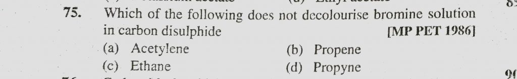 Which of the following does not decolourise bromine solution in carbon disulphide (a) Acetylene (b0 Propene (c) Ethane Which of the following does not decolourise bromine solution in carbon disulphide (a) Acetylene (b0 Propene (c) Ethane December 12, 2020 Category: Uncategorised (JEE Advanced Physics by BM Sharma + GMP Solutions) , Facebook Messenger WhatsApp Share this:TwitterFacebook Related