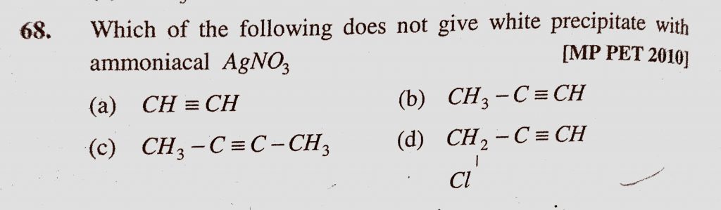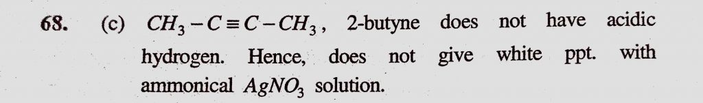 Which of the following does not give white precipitate with ammoniacal AgNO3 CH≡CH CH3−C≡CH CH3−C≡C−CH3 C∣ClH2−C≡CH Which of the following does not give white precipitate with ammoniacal AgNO3 CH≡CH CH3−C≡CH CH3−C≡C−CH3 C∣ClH2−C≡CH December 14, 2020 Category: Uncategorised (JEE Advanced Physics by BM Sharma + GMP Solutions) , Facebook Messenger WhatsApp Share this:TwitterFacebook Related