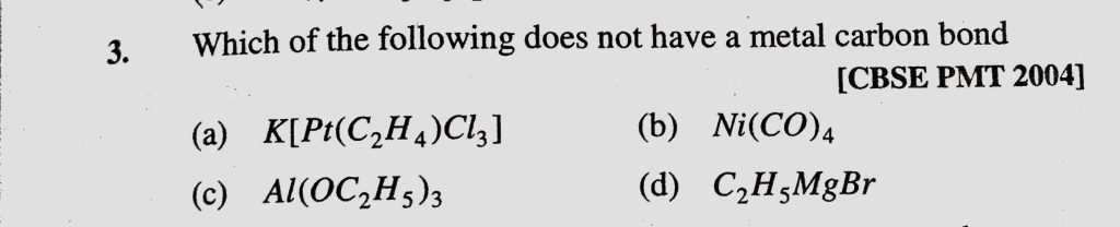 Which of the following does not have a metal carbon bond (a) K(Pt(C2H4)Cl3) (b) Ni(CO)4 Which of the following does not have a metal carbon bond (a) K(Pt(C2H4)Cl3) (b) Ni(CO)4 December 5, 2020 Category: Uncategorised (JEE Advanced Physics by BM Sharma + GMP Solutions) , Facebook Messenger WhatsApp Share this:TwitterFacebook Related