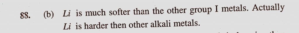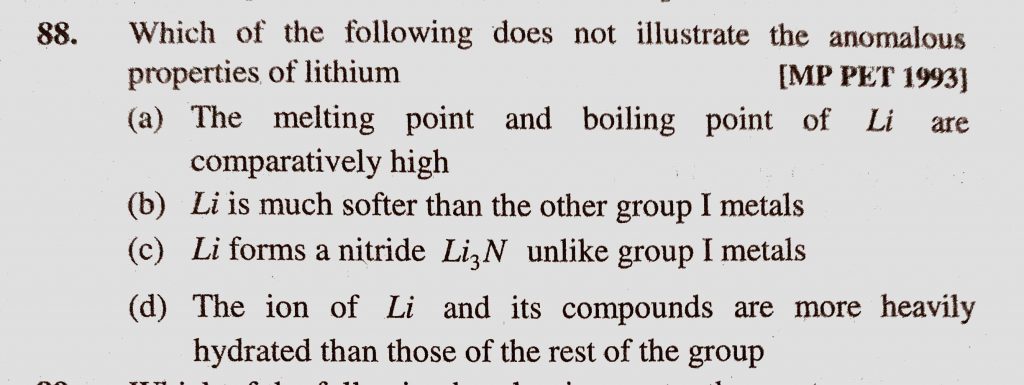 Which of the following does not illustrate the anomalous properties of lithium (a) The melting point and boiling point of Li are comparatively high Which of the following does not illustrate the anomalous properties of lithium (a) The melting point and boiling point of Li are comparatively high November 15, 2020 Category: Uncategorised (JEE Advanced Physics by BM Sharma + GMP Solutions) , Facebook Messenger WhatsApp Share this:TwitterFacebook Related