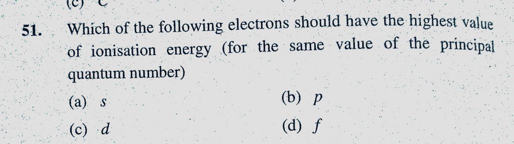 Which of the following electrons should have the highest value of ionisation energy (for the same value of the principal quantum number. (a) s (b) p (c) d (d) f Which of the following electrons should have the highest value of ionisation energy (for the same value of the principal quantum number. (a) s (b) p (c) d (d) f November 9, 2020 Category: Uncategorised (JEE Advanced Physics by BM Sharma + GMP Solutions) , Facebook Messenger WhatsApp Share this:TwitterFacebook Related