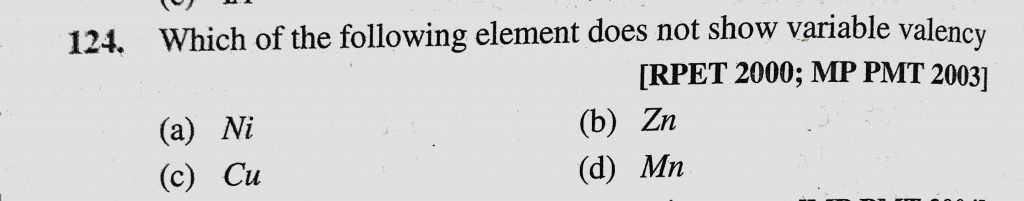 Which of the following element does not show variable valency (a) Ni (b) Zn (c) Cu (d) Mn Which of the following element does not show variable valency (a) Ni (b) Zn (c) Cu (d) Mn November 30, 2020 Category: Uncategorised (JEE Advanced Physics by BM Sharma + GMP Solutions) , Facebook Messenger WhatsApp Share this:TwitterFacebook Related