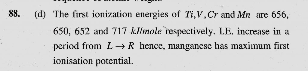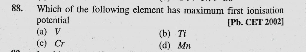 Which of the following element has maximum first ionisation potential (a) V (b) Ti (c) Cr (d) Mn Which of the following element has maximum first ionisation potential (a) V (b) Ti (c) Cr (d) Mn November 30, 2020 Category: Uncategorised (JEE Advanced Physics by BM Sharma + GMP Solutions) , Facebook Messenger WhatsApp Share this:TwitterFacebook Related