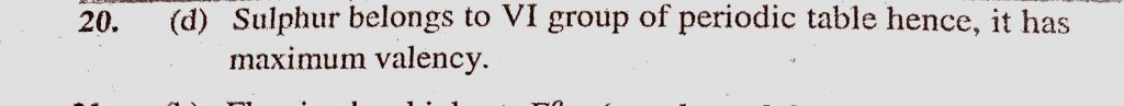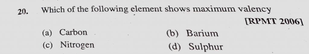 Which of the following element shows maximum valency (a) Carbon (b) Barium (c) Nitrogen (d) Sulphur Which of the following element shows maximum valency (a) Carbon (b) Barium (c) Nitrogen (d) Sulphur November 10, 2020 Category: Uncategorised (JEE Advanced Physics by BM Sharma + GMP Solutions) , Facebook Messenger WhatsApp Share this:TwitterFacebook Related