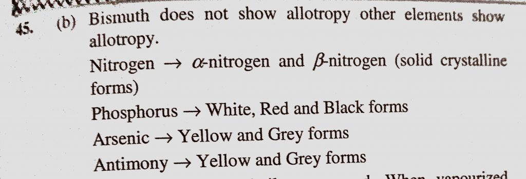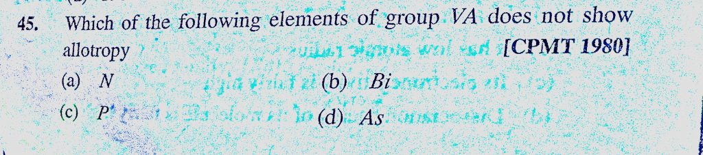 Which of the following elements of group VA does not show allotropy (a) N (b) Bi (c) P (d) As Which of the following elements of group VA does not show allotropy (a) N (b) Bi (c) P (d) As November 18, 2020 Category: Uncategorised (JEE Advanced Physics by BM Sharma + GMP Solutions) , Facebook Messenger WhatsApp Share this:TwitterFacebook Related