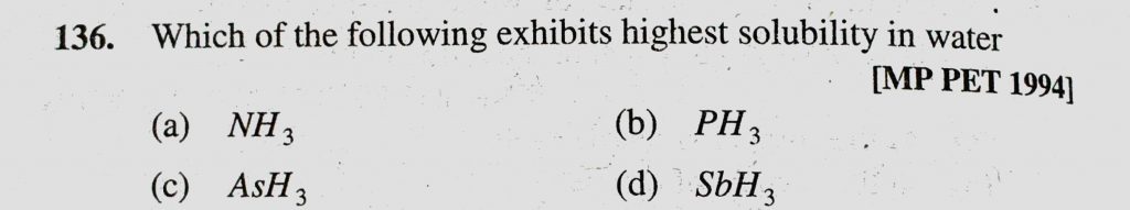 Which of the following exhibits highest solubility in water (a) NH3 (b) PH3 (c) AsH3 (d) SbH3 Which of the following exhibits highest solubility in water (a) NH3 (b) PH3 (c) AsH3 (d) SbH3 November 23, 2020 Category: Uncategorised (JEE Advanced Physics by BM Sharma + GMP Solutions) , Facebook Messenger WhatsApp Share this:TwitterFacebook Related