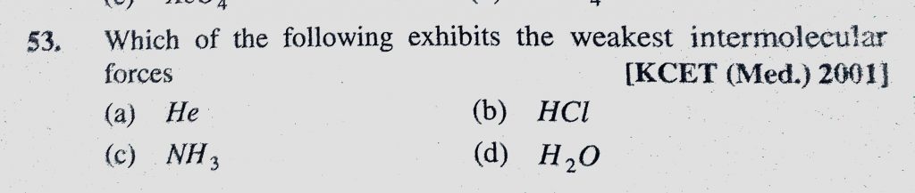 Which of the following exhibits the weakest intermolecular forces (a) He (b) HCl (c) NH3 (d) H2O Which of the following exhibits the weakest intermolecular forces (a) He (b) HCl (c) NH3 (d) H2O November 25, 2020 Category: Uncategorised (JEE Advanced Physics by BM Sharma + GMP Solutions) , Facebook Messenger WhatsApp Share this:TwitterFacebook Related
