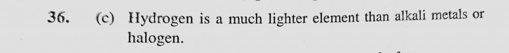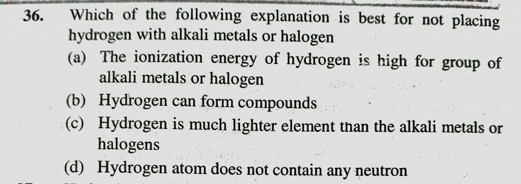 Which of the following explanation is best for not placing hydrogen with alkali metals or halogen (a) The ionization energy of hydrogen is high for group of alkali metals or halogen Which of the following explanation is best for not placing hydrogen with alkali metals or halogen (a) The ionization energy of hydrogen is high for group of alkali metals or halogen November 13, 2020 Category: Uncategorised (JEE Advanced Physics by BM Sharma + GMP Solutions) , Facebook Messenger WhatsApp Share this:TwitterFacebook Related