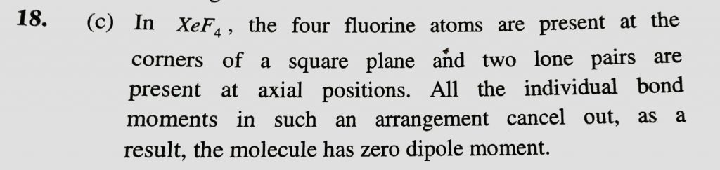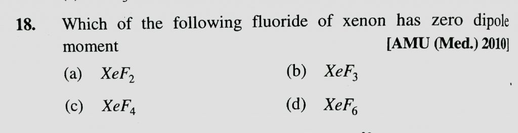 Which of the following fluoride of xenon has zero dipole moment (a) XeF2 (b) XeF3 (c) XeF4 (d) XeF6 Which of the following fluoride of xenon has zero dipole moment (a) XeF2 (b) XeF3 (c) XeF4 (d) XeF6 December 2, 2020 Category: Uncategorised (JEE Advanced Physics by BM Sharma + GMP Solutions) , Facebook Messenger WhatsApp Share this:TwitterFacebook Related