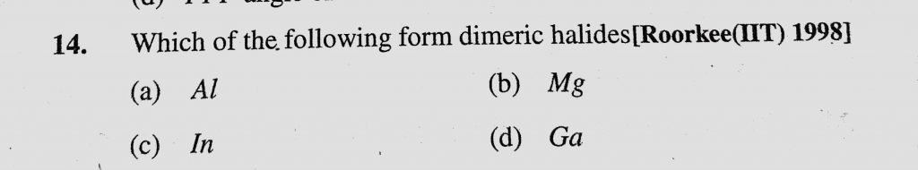 Which of the following form dimeric halides (a) Al (b) Mg (c) In (d) Ga Which of the following form dimeric halides (a) Al (b) Mg (c) In (d) Ga November 28, 2020 Category: Uncategorised (JEE Advanced Physics by BM Sharma + GMP Solutions) , Facebook Messenger WhatsApp Share this:TwitterFacebook Related