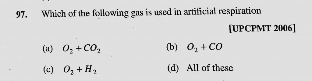 Which of the following gas is used in artificial respiration (a) O2 + CO2 (b) O2 + CO (c) O2 + H2 Which of the following gas is used in artificial respiration (a) O2 + CO2 (b) O2 + CO (c) O2 + H2 November 23, 2020 Category: Uncategorised (JEE Advanced Physics by BM Sharma + GMP Solutions) , Facebook Messenger WhatsApp Share this:TwitterFacebook Related