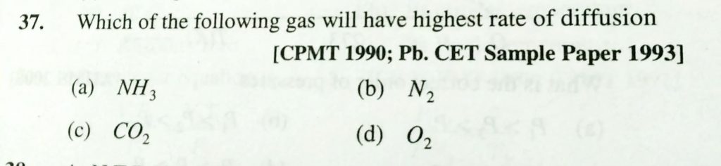 Which of the following gas will have highest rate of diffusion (a) NH3 (b) N2 (c) CO2 (d) O2 Which of the following gas will have highest rate of diffusion (a) NH3 (b) N2 (c) CO2 (d) O2 February 10, 2021 Category: Uncategorised (JEE Advanced Physics by BM Sharma + GMP Solutions) , Facebook Messenger WhatsApp Share this:TwitterFacebook Related