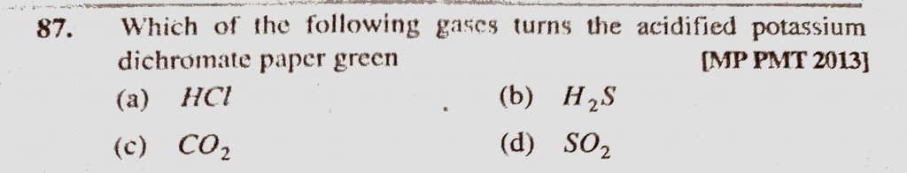 Which of the following gases turns the acidified potassium dichromate paper green (a) HCl (b) H2S (c) CO2 (d) SO2 Which of the following gases turns the acidified potassium dichromate paper green (a) HCl (b) H2S (c) CO2 (d) SO2 November 15, 2020 Category: Uncategorised (JEE Advanced Physics by BM Sharma + GMP Solutions) , Facebook Messenger WhatsApp Share this:TwitterFacebook Related