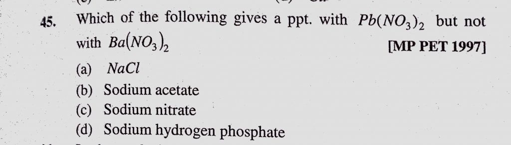 Which of the following gives a ppt. with Pb(NO3)2 but not with Ba(NO3)2 (a) NaCl (b) Sodium acetate Which of the following gives a ppt. with Pb(NO3)2 but not with Ba(NO3)2 (a) NaCl (b) Sodium acetate December 7, 2020 Category: Uncategorised (JEE Advanced Physics by BM Sharma + GMP Solutions) , Facebook Messenger WhatsApp Share this:TwitterFacebook Related