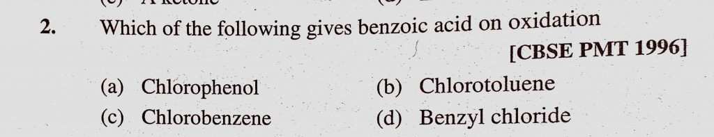 Which of the following gives benzoic acid on oxidation (a) Chlorophenol (b) Chlorotoluene (c) Chlorobenzene (d) Benzyl chloride Which of the following gives benzoic acid on oxidation (a) Chlorophenol (b) Chlorotoluene (c) Chlorobenzene (d) Benzyl chloride February 12, 2021 Category: Uncategorised (JEE Advanced Physics by BM Sharma + GMP Solutions) , Facebook Messenger WhatsApp Share this:TwitterFacebook Related