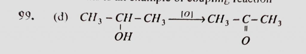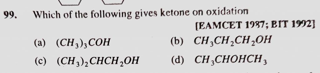 Which of the following gives ketone on oxidation (a) (CH3)3COH (b) CH3CH2CH2OH (c) (CH3)2CHCH2OH (d) CH3CHOHCH3 Which of the following gives ketone on oxidation (a) (CH3)3COH (b) CH3CH2CH2OH (c) (CH3)2CHCH2OH (d) CH3CHOHCH3 February 13, 2021 Category: Uncategorised (JEE Advanced Physics by BM Sharma + GMP Solutions) , Facebook Messenger WhatsApp Share this:TwitterFacebook Related
