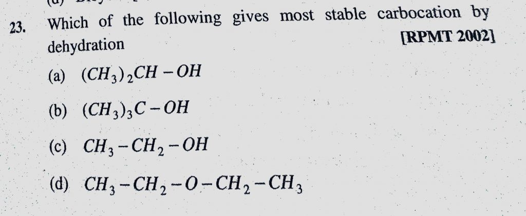 Which of the following gives most stable carbocation by dehydration (a) (CH3)2CH-OH (b) (CH3)C-OH (c) CH3-CH2-OH Which of the following gives most stable carbocation by dehydration (a) (CH3)2CH-OH (b) (CH3)C-OH (c) CH3-CH2-OH December 11, 2020 Category: Uncategorised (JEE Advanced Physics by BM Sharma + GMP Solutions) , Facebook Messenger WhatsApp Share this:TwitterFacebook Related