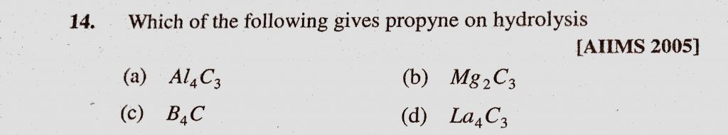 Which of the following gives propyne on hydrolysis (a) Al4C3 (b) Mg2C3 (c) B4C (d) La4C3 Which of the following gives propyne on hydrolysis (a) Al4C3 (b) Mg2C3 (c) B4C (d) La4C3 November 17, 2020 Category: Uncategorised (JEE Advanced Physics by BM Sharma + GMP Solutions) , Facebook Messenger WhatsApp Share this:TwitterFacebook Related