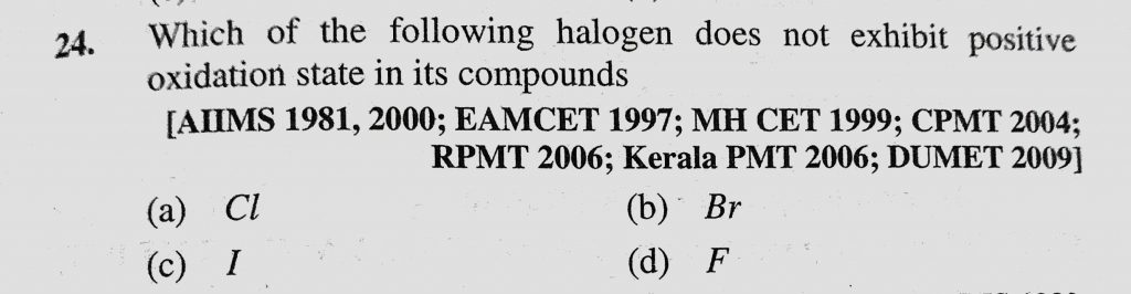 Which of the following halogen does not exhibit positive oxidation state in its compounds (a) Cl (b) Br (c) I (d) F Which of the following halogen does not exhibit positive oxidation state in its compounds (a) Cl (b) Br (c) I (d) F November 24, 2020 Category: Uncategorised (JEE Advanced Physics by BM Sharma + GMP Solutions) , Facebook Messenger WhatsApp Share this:TwitterFacebook Related