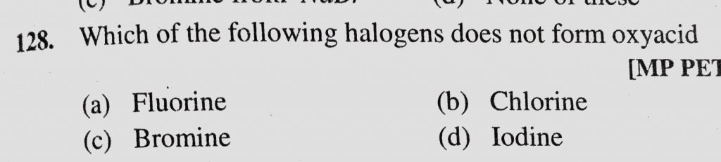 Which of the following halogens does not form oxyacid (a) Fluorine (b) Chlorine (c) Bromine (d) Iodine Which of the following halogens does not form oxyacid (a) Fluorine (b) Chlorine (c) Bromine (d) Iodine November 24, 2020 Category: Uncategorised (JEE Advanced Physics by BM Sharma + GMP Solutions) , Facebook Messenger WhatsApp Share this:TwitterFacebook Related