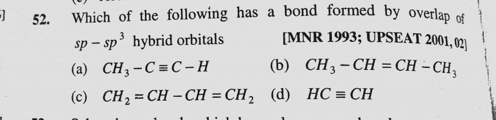 Which of the following has a bond formed by overlap of sp-sp3 hybrid orbitals Which of the following has a bond formed by overlap of sp-sp3 hybrid orbitals December 8, 2020 Category: Uncategorised (JEE Advanced Physics by BM Sharma + GMP Solutions) , Facebook Messenger WhatsApp Share this:TwitterFacebook Related