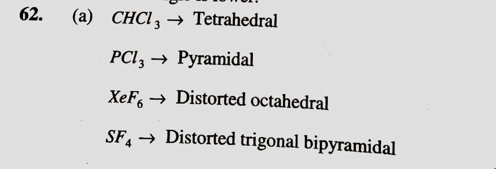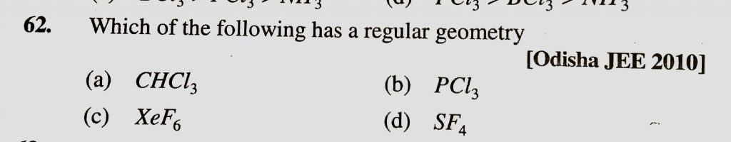 Which of the following has a regular geometry (a) CHCL3 (b) PCL3 (c) XeF6 (d) SF4 Which of the following has a regular geometry (a) CHCL3 (b) PCL3 (c) XeF6 (d) SF4 December 7, 2020 Category: Uncategorised (JEE Advanced Physics by BM Sharma + GMP Solutions) , Facebook Messenger WhatsApp Share this:TwitterFacebook Related