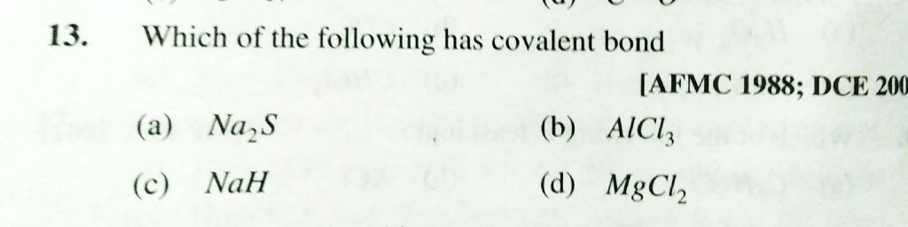 Which of the following has covalent bond (a) Na2S (b) AlCl3 (c) NaH (d0 MgCl2 Which of the following has covalent bond (a) Na2S (b) AlCl3 (c) NaH (d0 MgCl2 December 1, 2020 Category: Uncategorised (JEE Advanced Physics by BM Sharma + GMP Solutions) , Facebook Messenger WhatsApp Share this:TwitterFacebook Related