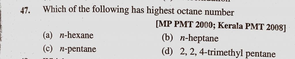 Which of the following has highest octane number (a) n-hexane (b) n-heptane (c) n-pentane Which of the following has highest octane number (a) n-hexane (b) n-heptane (c) n-pentane December 12, 2020 Category: Uncategorised (JEE Advanced Physics by BM Sharma + GMP Solutions) , Facebook Messenger WhatsApp Share this:TwitterFacebook Related