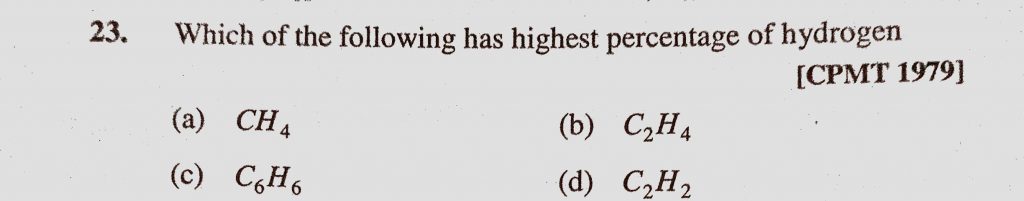 Which of the following has highest percentage of hydrogen (a) CH4 (b) C2H4 (c) C6H6 (d) C2H2 Which of the following has highest percentage of hydrogen (a) CH4 (b) C2H4 (c) C6H6 (d) C2H2 December 12, 2020 Category: Uncategorised (JEE Advanced Physics by BM Sharma + GMP Solutions) , Facebook Messenger WhatsApp Share this:TwitterFacebook Related
