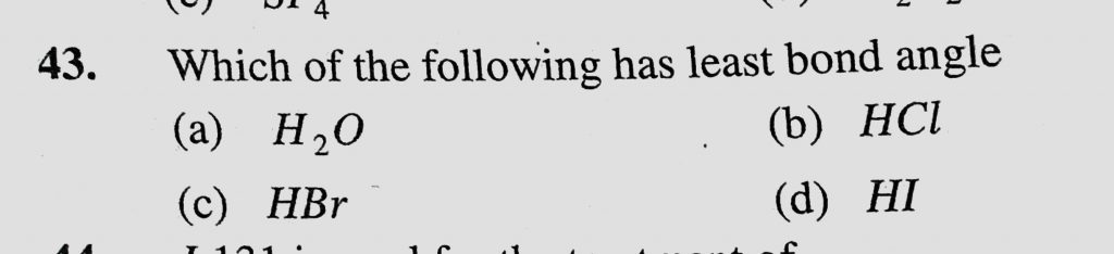 Which of the following has least bond angle (a) H2O (b) HCl (c) HBr (d) HI Which of the following has least bond angle (a) H2O (b) HCl (c) HBr (d) HI November 24, 2020 Category: Uncategorised (JEE Advanced Physics by BM Sharma + GMP Solutions) , Facebook Messenger WhatsApp Share this:TwitterFacebook Related