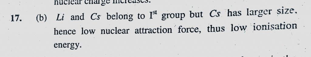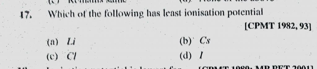 Which of the following has least ionisation potential (a) Li (b) Cs (c) Cl (d) I Which of the following has least ionisation potential (a) Li (b) Cs (c) Cl (d) I November 9, 2020 Category: Uncategorised (JEE Advanced Physics by BM Sharma + GMP Solutions) , Facebook Messenger WhatsApp Share this:TwitterFacebook Related