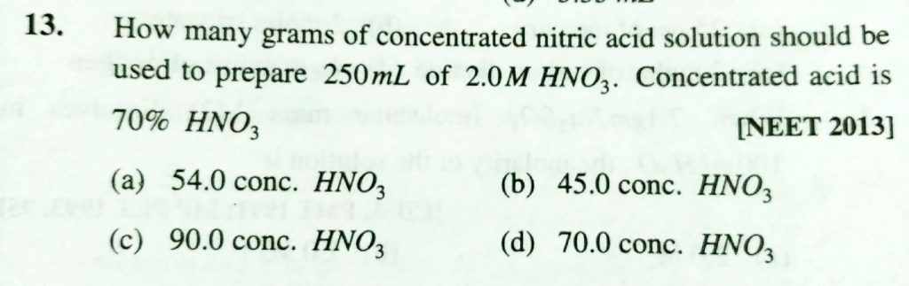 How many grams of concentrated nitric acid solution should be used to prepare 250 mL of 2.0 M HNO3? The concentrated acid is 70% HNO3: How many grams of concentrated nitric acid solution should be used to prepare 250 mL of 2.0 M HNO3? The concentrated acid is 70% HNO3: December 10, 2020 Category: Uncategorised (JEE Advanced Physics by BM Sharma + GMP Solutions) , Facebook Messenger WhatsApp Share this:TwitterFacebook Related