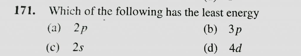 Which of the following has the least energy (a) 2p (b) 3p (c) 2 s (d) 4 d Which of the following has the least energy (a) 2p (b) 3p (c) 2 s (d) 4 d November 29, 2020 Category: Uncategorised (JEE Advanced Physics by BM Sharma + GMP Solutions) , Facebook Messenger WhatsApp Share this:TwitterFacebook Related