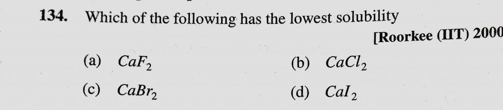 Which of the following has the lowest solubility (a) CaF2 (b) CaCl2 (c) CaBr2 (d) CaI2 Which of the following has the lowest solubility (a) CaF2 (b) CaCl2 (c) CaBr2 (d) CaI2 November 27, 2020 Category: Uncategorised (JEE Advanced Physics by BM Sharma + GMP Solutions) , Facebook Messenger WhatsApp Share this:TwitterFacebook Related