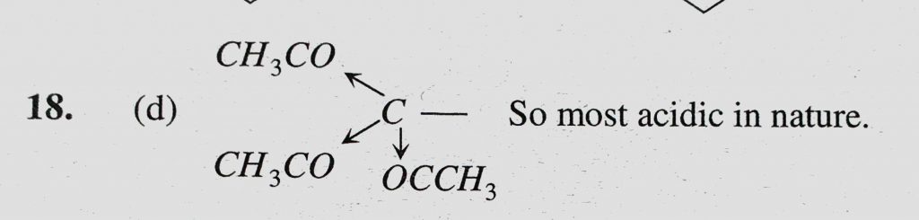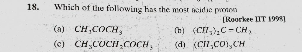 Which of the following has the most acidic proton (a) CH3COCH3 (b) (CH3)2C = CH2 (c) CH3COCH2COCH3 (d) (CH3CO)3CH Which of the following has the most acidic proton (a) CH3COCH3 (b) (CH3)2C = CH2 (c) CH3COCH2COCH3 (d) (CH3CO)3CH February 13, 2021 Category: Uncategorised (JEE Advanced Physics by BM Sharma + GMP Solutions) , Facebook Messenger WhatsApp Share this:TwitterFacebook Related