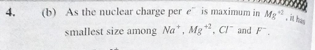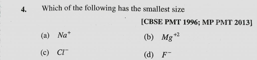 Which of the following has the smallest size (a) Na + (b) Mg +2 (c) Cl – (d) F – Which of the following has the smallest size (a) Na + (b) Mg +2 (c) Cl - (d) F - November 9, 2020 Category: Uncategorised (JEE Advanced Physics by BM Sharma + GMP Solutions) , Facebook Messenger WhatsApp Share this:TwitterFacebook Related