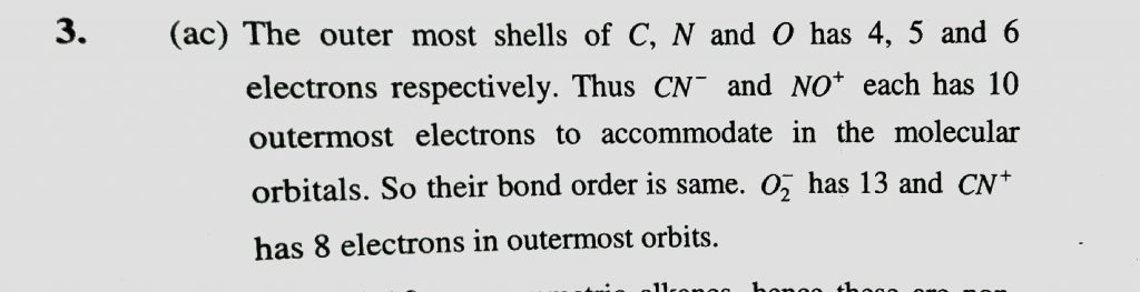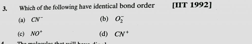 Which of the following have identical bond order (a) CN^- (b) O2^- (c) NO^+ (d) CN^+ Which of the following have identical bond order (a) CN^- (b) O2^- (c) NO^+ (d) CN^+ December 10, 2020 Category: Uncategorised (JEE Advanced Physics by BM Sharma + GMP Solutions) , Facebook Messenger WhatsApp Share this:TwitterFacebook Related