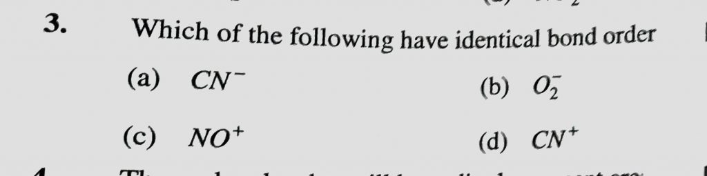 Which of the following have identical bond order (a) CN^- (b) O2^- (c) NO^+ (d) CN^+ Which of the following have identical bond order (a) CN^- (b) O2^- (c) NO^+ (d) CN^+ December 15, 2020 Category: Uncategorised (JEE Advanced Physics by BM Sharma + GMP Solutions) , Facebook Messenger WhatsApp Share this:TwitterFacebook Related