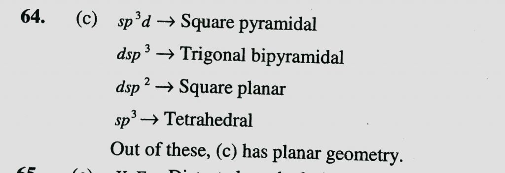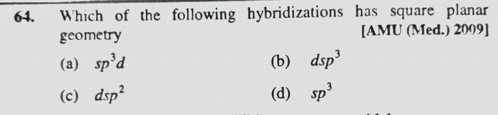 Which of the following hybridizations has square planar geometery (a) sp^3d (b) dsp^3 (c) dsp^2 (d) sp^3 Which of the following hybridizations has square planar geometery (a) sp^3d (b) dsp^3 (c) dsp^2 (d) sp^3 December 6, 2020 Category: Uncategorised (JEE Advanced Physics by BM Sharma + GMP Solutions) , Facebook Messenger WhatsApp Share this:TwitterFacebook Related