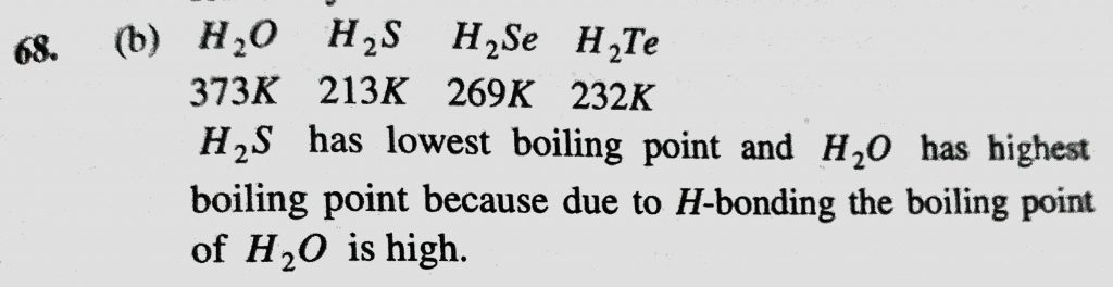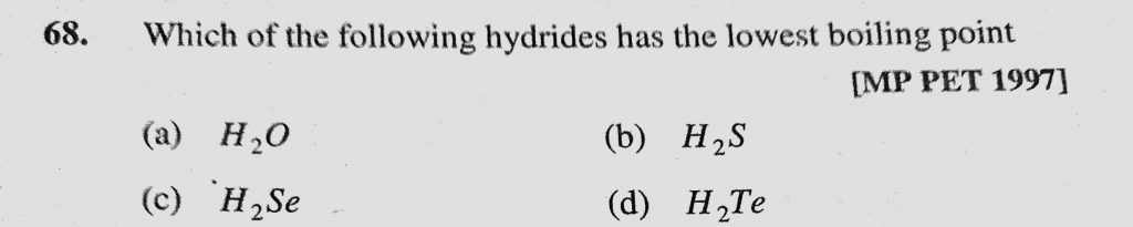 Which of the following hydrides has the lowest boiling point (a) H2O (b) H2S (c) H2Se (d) H2Te Which of the following hydrides has the lowest boiling point (a) H2O (b) H2S (c) H2Se (d) H2Te November 23, 2020 Category: Uncategorised (JEE Advanced Physics by BM Sharma + GMP Solutions) , Facebook Messenger WhatsApp Share this:TwitterFacebook Related