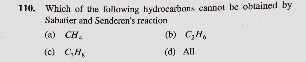 Which of the following hydrocarbons cannot be obtained by Sabatier and Senderen’s reaction (a) CH4 (b) C2H6 (c) C3H8 (d) All Which of the following hydrocarbons cannot be obtained by Sabatier and Senderen's reaction (a) CH4 (b) C2H6 (c) C3H8 (d) All December 14, 2020 Category: Uncategorised (JEE Advanced Physics by BM Sharma + GMP Solutions) , Facebook Messenger WhatsApp Share this:TwitterFacebook Related