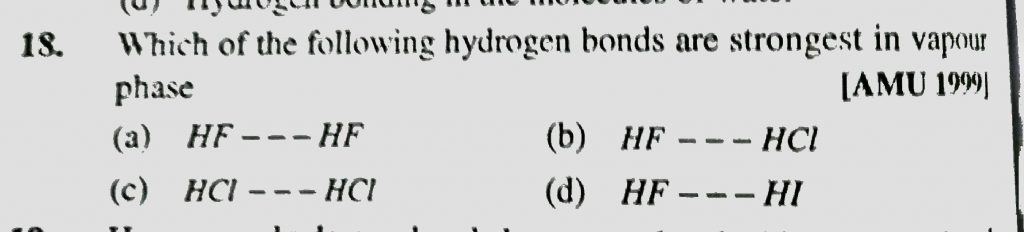Which of the following hydrogen bonds are strongest in vapour phase (a) HF — HF (b) HF — HCL (c) HCL — HCL (d) HF — HI Which of the following hydrogen bonds are strongest in vapour phase (a) HF --- HF (b) HF --- HCL (c) HCL --- HCL (d) HF --- HI December 9, 2020 Category: Uncategorised (JEE Advanced Physics by BM Sharma + GMP Solutions) , Facebook Messenger WhatsApp Share this:TwitterFacebook Related