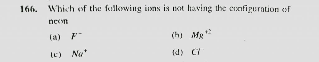 Which of the following ions is not having the configuration of neon (a) F^- (b) Mg^+2 (c) Na^+ (d) Cl^- Which of the following ions is not having the configuration of neon (a) F^- (b) Mg^+2 (c) Na^+ (d) Cl^- November 29, 2020 Category: Uncategorised (JEE Advanced Physics by BM Sharma + GMP Solutions) , Facebook Messenger WhatsApp Share this:TwitterFacebook Related