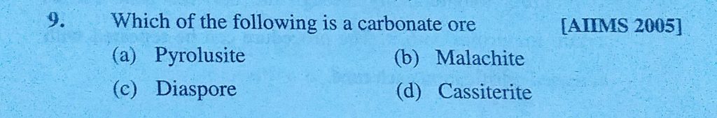 Which of the following is a carbonate ore (a) Pyrolusite (b) Malachite (c) Diaspore (d) Cassiterite Which of the following is a carbonate ore (a) Pyrolusite (b) Malachite (c) Diaspore (d) Cassiterite November 11, 2020 Category: Uncategorised (JEE Advanced Physics by BM Sharma + GMP Solutions) , Facebook Messenger WhatsApp Share this:TwitterFacebook Related