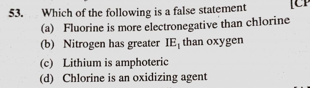 Which of the following is a false statement (a) Fluorine is more electronegative than chlorine (b) Nitrogen has greater IE1 than oxygen Which of the following is a false statement (a) Fluorine is more electronegative than chlorine (b) Nitrogen has greater IE1 than oxygen November 13, 2020 Category: Uncategorised (JEE Advanced Physics by BM Sharma + GMP Solutions) , Facebook Messenger WhatsApp Share this:TwitterFacebook Related