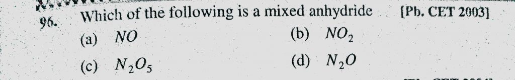 Which of the following is a mixed anhydride (a) NO (b) NO2 (c) N2O5 (d) N2O Which of the following is a mixed anhydride (a) NO (b) NO2 (c) N2O5 (d) N2O November 18, 2020 Category: Uncategorised (JEE Advanced Physics by BM Sharma + GMP Solutions) , Facebook Messenger WhatsApp Share this:TwitterFacebook Related