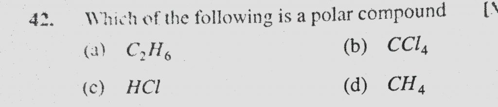 Which of the following is a polar compound (a) C2H6 (b) CCl4 (c) HCl (d) CH4 Which of the following is a polar compound (a) C2H6 (b) CCl4 (c) HCl (d) CH4 December 9, 2020 Category: Uncategorised (JEE Advanced Physics by BM Sharma + GMP Solutions) , Facebook Messenger WhatsApp Share this:TwitterFacebook Related