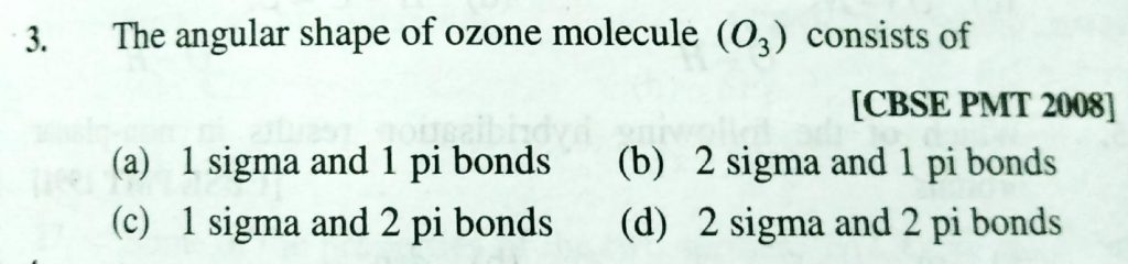 THe angular shape of ozone molecule (O3) consists of (a) 1 Sigma and 1 pi bonds (b) 2sigma and 1 pi bonds (c0 1 sigma and 2 pi bonds (d) 2 sigma and 2 pi bonds THe angular shape of ozone molecule (O3) consists of (a) 1 Sigma and 1 pi bonds (b) 2sigma and 1 pi bonds (c0 1 sigma and 2 pi bonds (d) 2 sigma and 2 pi bonds December 2, 2020 Category: Uncategorised (JEE Advanced Physics by BM Sharma + GMP Solutions) , Facebook Messenger WhatsApp Share this:TwitterFacebook Related