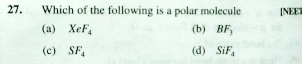 Which of the following is a polar molecule (a) XeF4 (b) BF3 (c) SF4 (d) SiF4 Which of the following is a polar molecule (a) XeF4 (b) BF3 (c) SF4 (d) SiF4 December 2, 2020 Category: Uncategorised (JEE Advanced Physics by BM Sharma + GMP Solutions) , Facebook Messenger WhatsApp Share this:TwitterFacebook Related